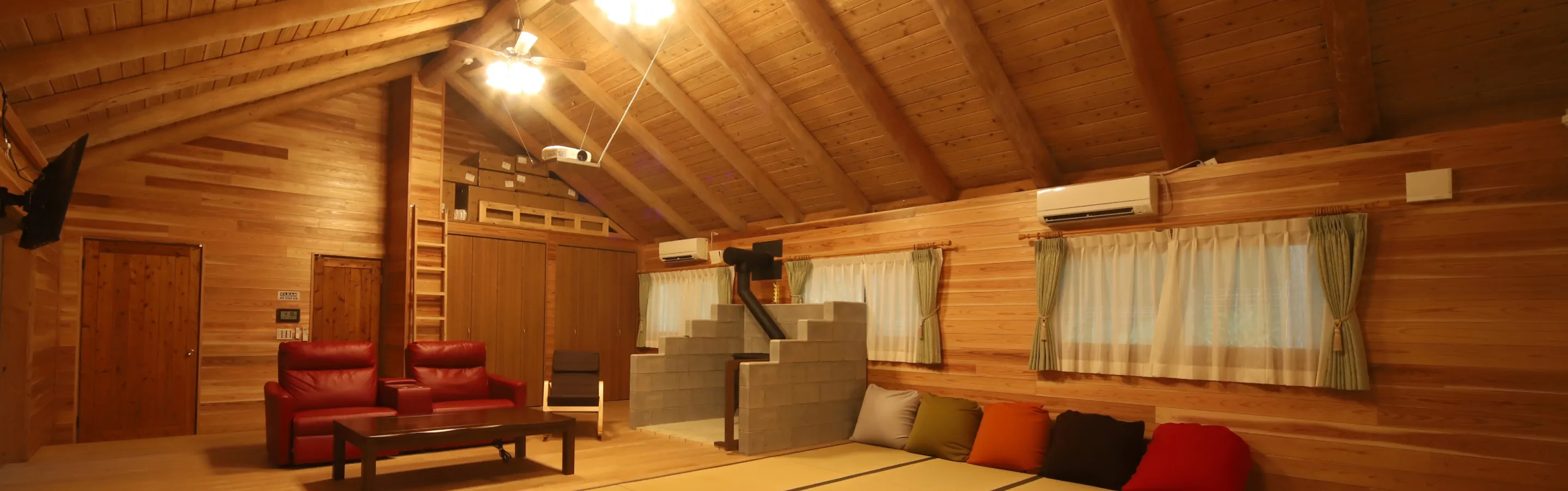 宿泊場所も、大広間のシアタールームからそれぞれ特徴のあるコテージや、テントで寝たいという自然派キャンパーにはテントも設置しており、ふかふかのベッドも配置しています。